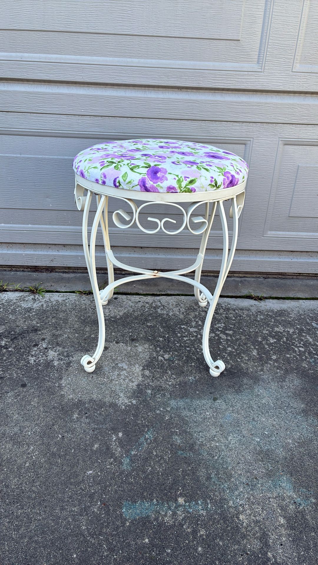 Metal vanity stool with floral print. Used in good condition. Cushion 14” Diameter. 18” Height.
