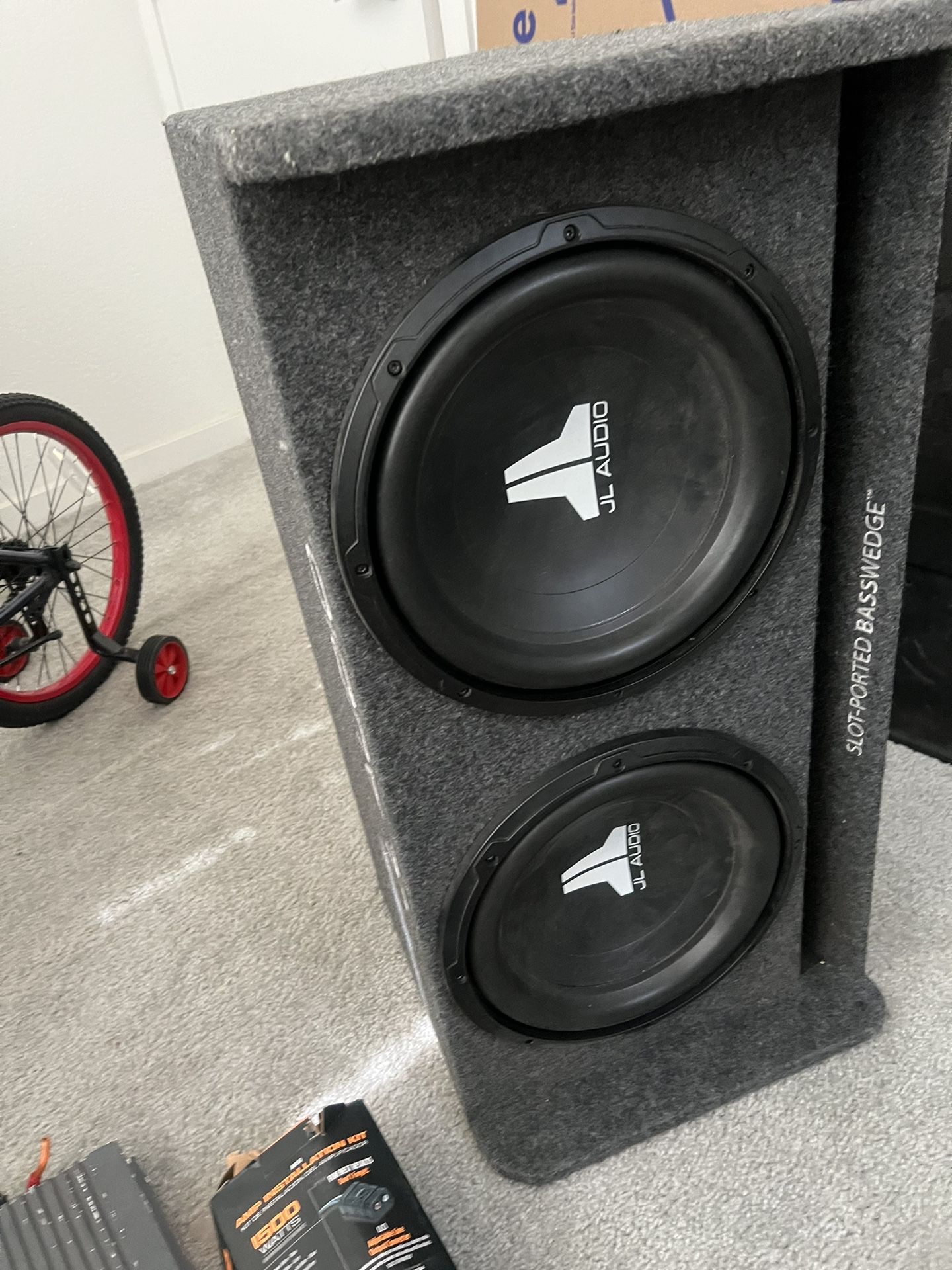 Sounds great. 2 12’s in a bandpass box like only JL Audio can design Box dimensions 20.5 32 15 height 2000 watt crunch amp Throwing in for free a 600 w planet audio four channel amp for highs and mids as well as an amp kit for whatever parts are still in there.