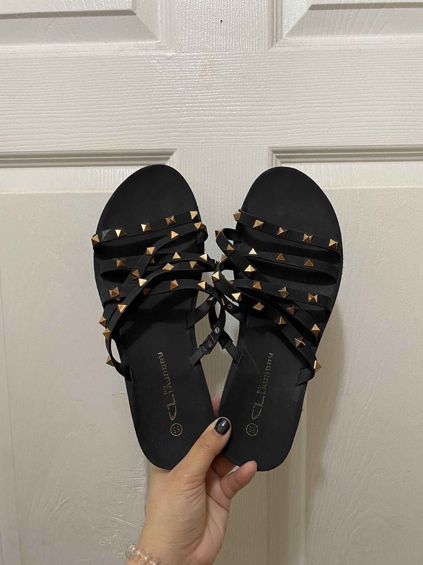 CL By Chinese Laundry Black Gold Studded Criss Cross Strap Flat Sandals