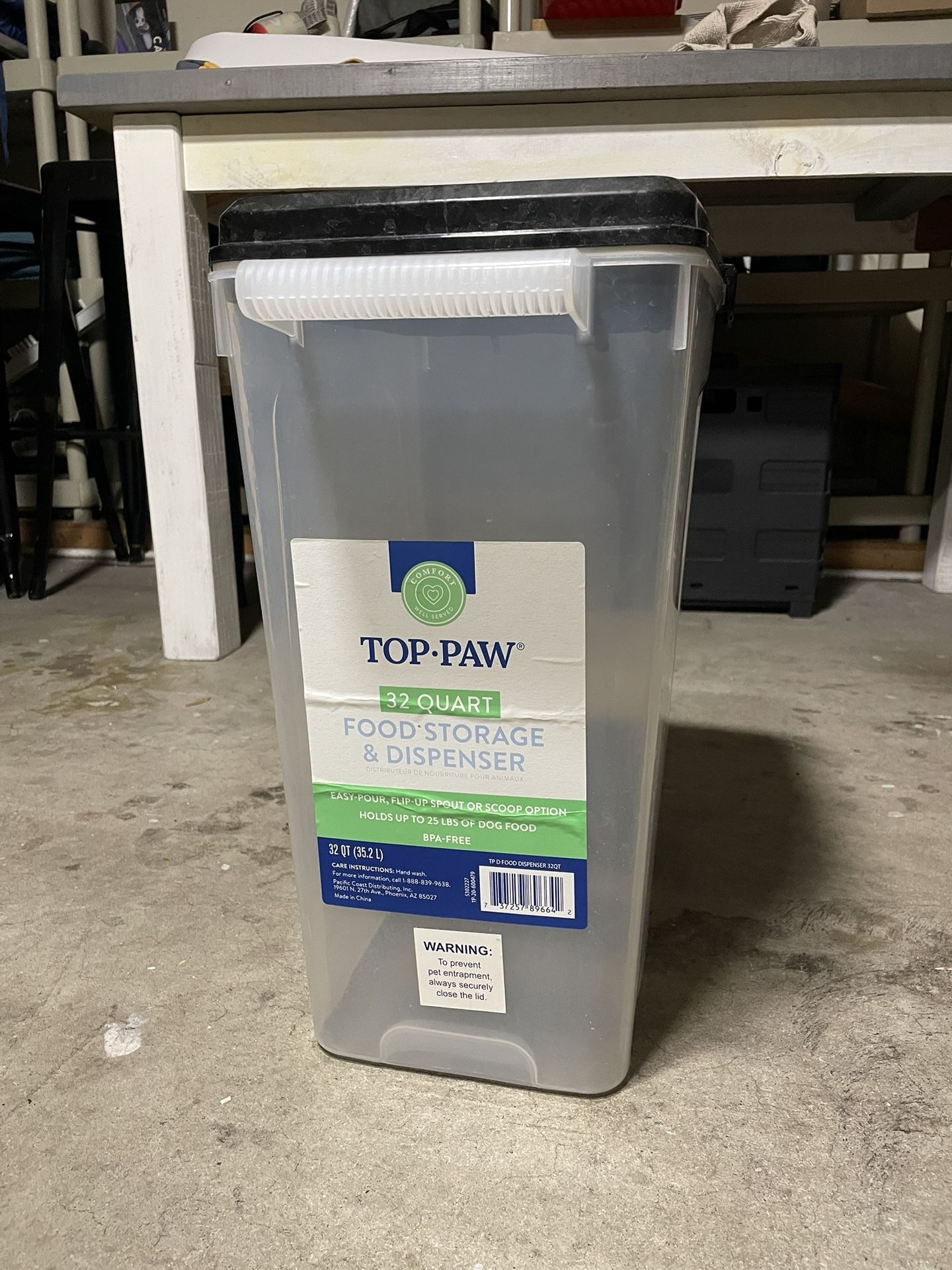 Top Paw 32Qt Dog Food Container with removable lid and ability to pour with lid flap. No longer use this as I have a smaller version that fits in our cabinet.
