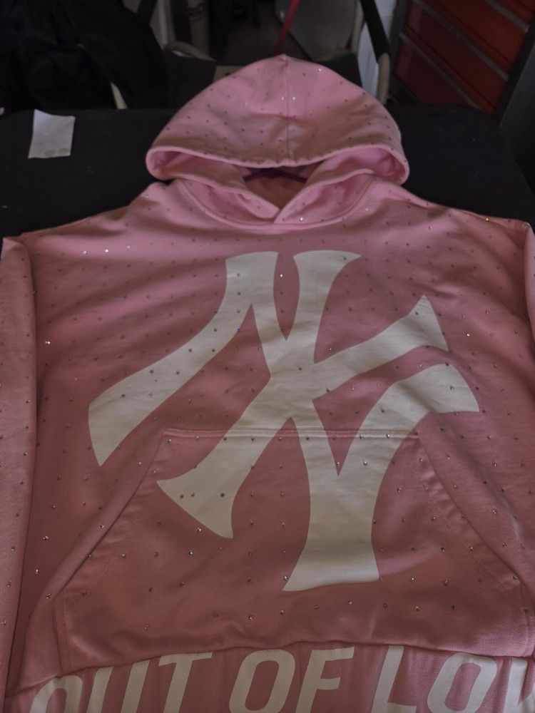 Small stain on hood, not crazy noticable. brand is @outoflove.clothingbrand Need to put inside out when washing and air dry!