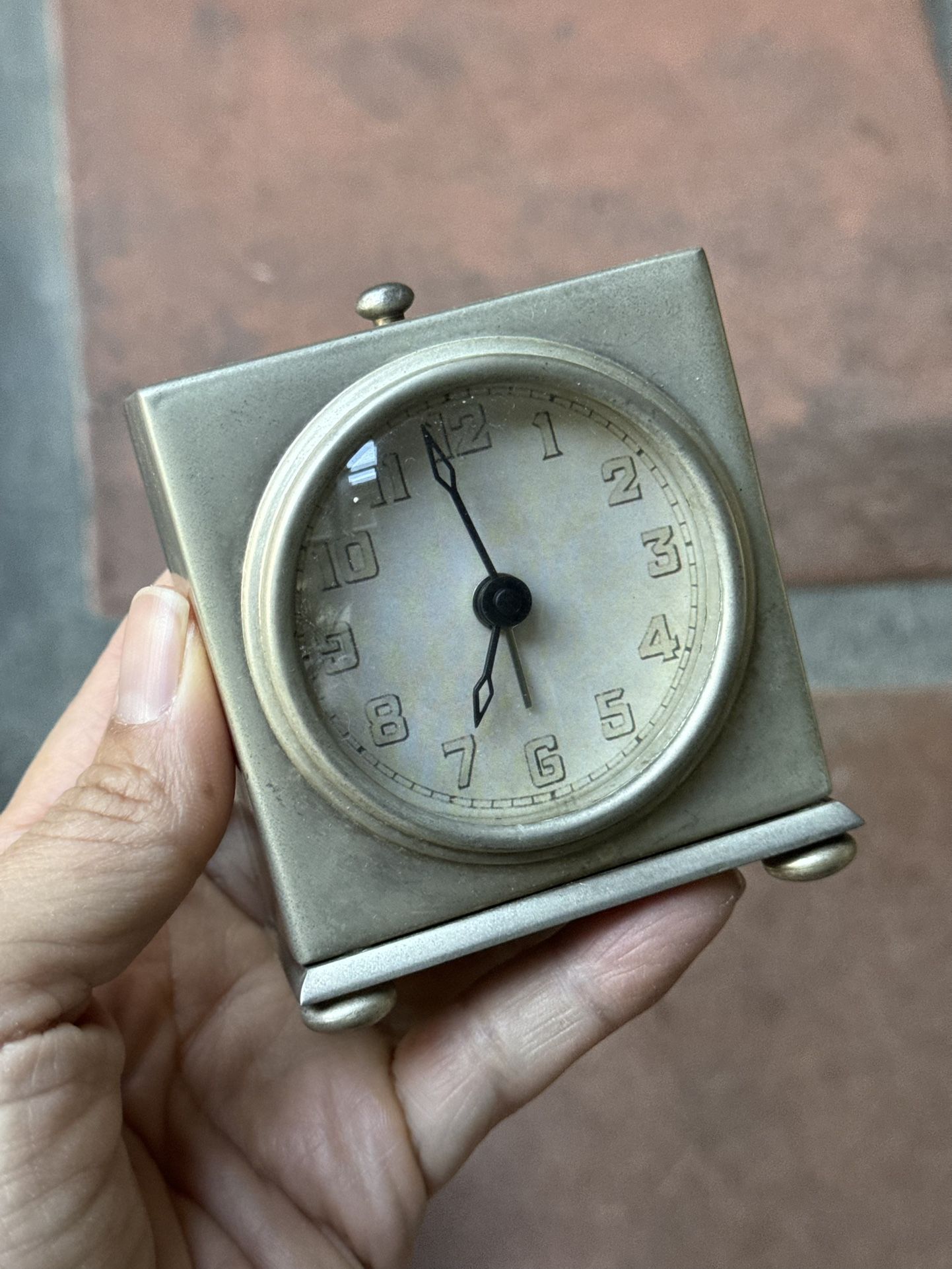 Add timeless charm to your space with this vintage Pottery Barn carriage-style alarm clock. Crafted in an antique silver–tone metal with a classic square silhouette, this piece channels old-world elegance while remaining versatile for modern décor. Features & Details: Authentic Pottery Barn design Antique silver finish with a softly aged patina Square carriage clock style with rounded feet Easy-to-read analog face with black hands and raised numerals Top-mounted knob for setting time/alarm Compact size—perfect for a nightstand, desk, bookshelf, or mantel