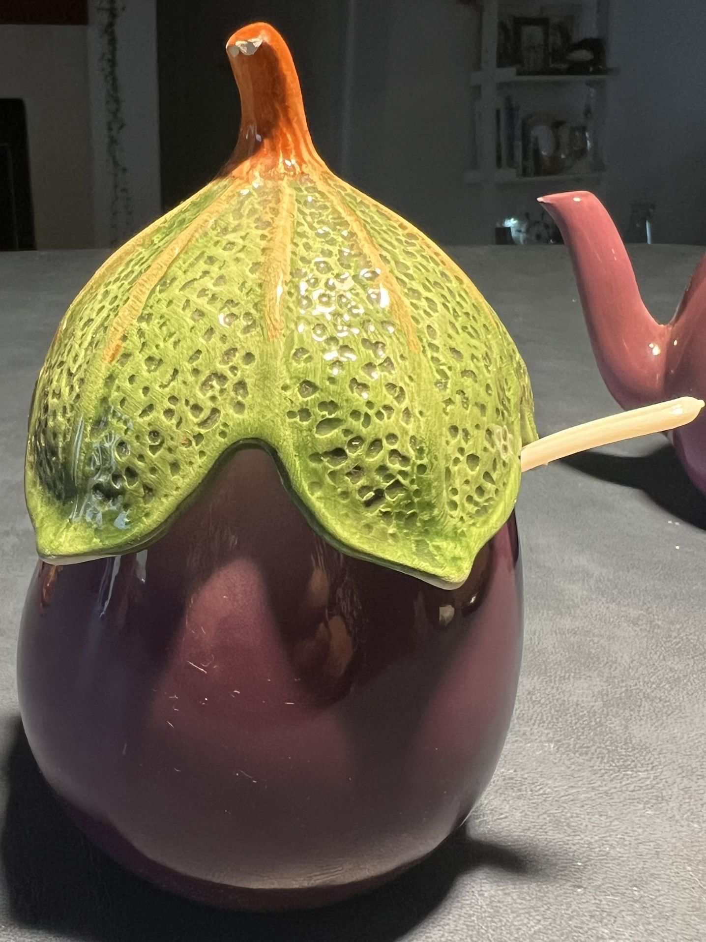 This is a ceramic sugar bowl and lid, part of a set often designed to look like a cantaloupe or melon. This one is an eggplant. It is made of earthenware or ceramic with a textured, detailed exterior designed to mimic an eggplant rind. The interior is smooth and typically light-colored. These items are often considered vintage, with some sets dating back to the 1960s or 1980s. The vintage item includes a small serving spoon and this was purchased in the 1980’s and has been in storage for many years. In the pictures there is a grouping of similar items that will be posted shortly We’re happy to offer a price for the group or partials Please view our 3 generations estate sale items Make offer B4