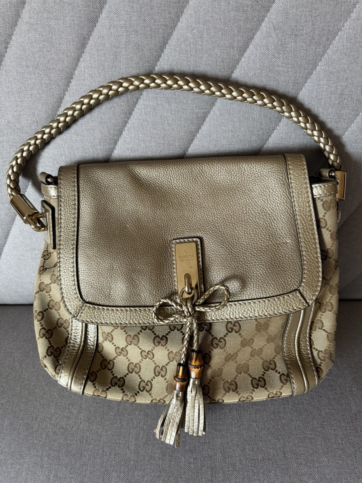 GUCCI 2-Way Bamboo Shoulder Bag Handbag – Rare Vintage Style This rare vintage Gucci bamboo bag brings together some of the brand’s most iconic design elements in one elegant piece. Design Highlights: • Signature bamboo tassel accents • Braided top handle – beautifully crafted and rarely seen in modern collections • Designed for 2-way use: shoulder or handheld (crossbody strap is missing) Condition: • Gently used with only a few signs of wear • Leather remains in excellent condition • Hardware shows minor surface scratches, consistent with light use • No odors or major flaws Included Accessories: • Strap missing • No dust bag or box included Measurements (approx.): • Height: 10.5 in • Width: 12 in • Depth: 5.5 in This is a hard-to-find vintage Gucci piece—timeless, practical, and ideal for collectors or daily use.