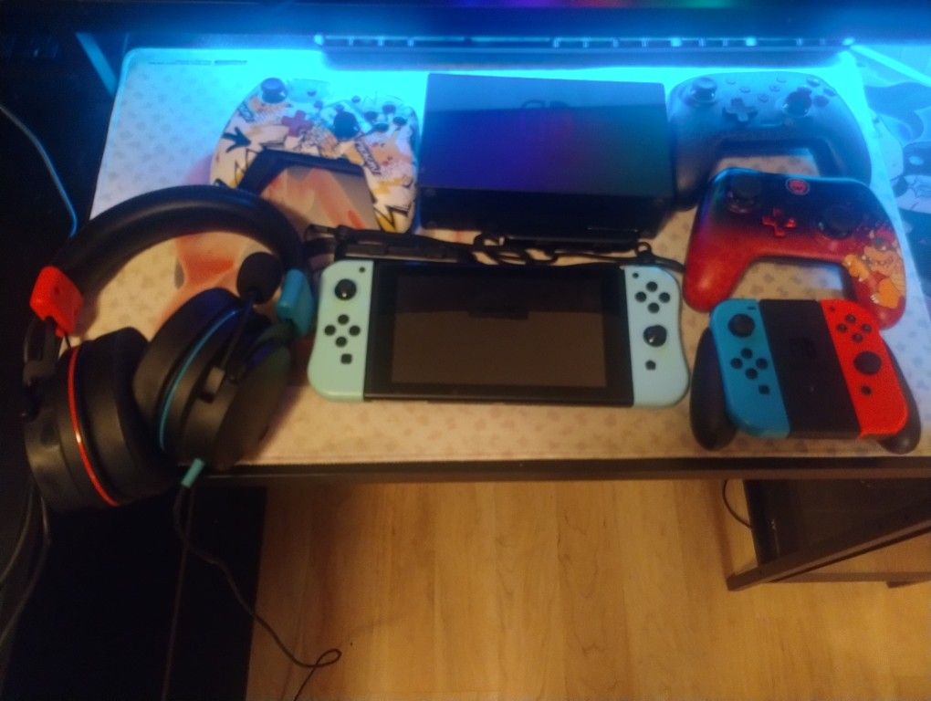 Nintendo switch bundle Comes with three controllers, for joycons, a headset, charging dock, charger, HDMI cord, and Nintendo switch. No games included my account will be removed. Everything works great! 150 firm. Trading for a GPU.