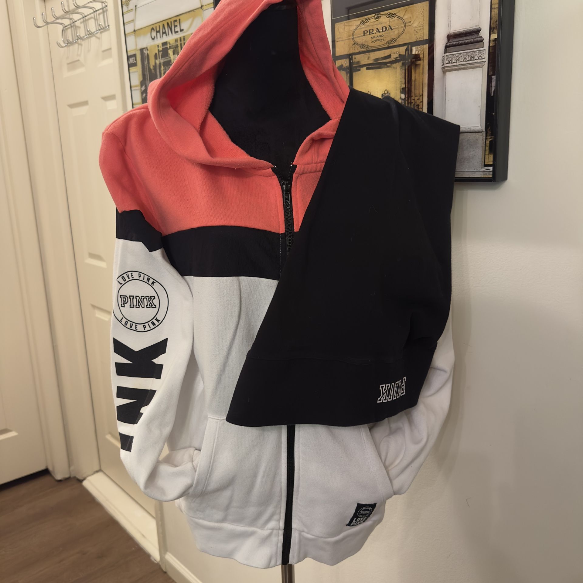 Excellent condition, Victoria’s Secret, pink full zip hoodie, sweatshirt, multicolored size extra large paired with black Victoria’s Secret pink leggings, size large