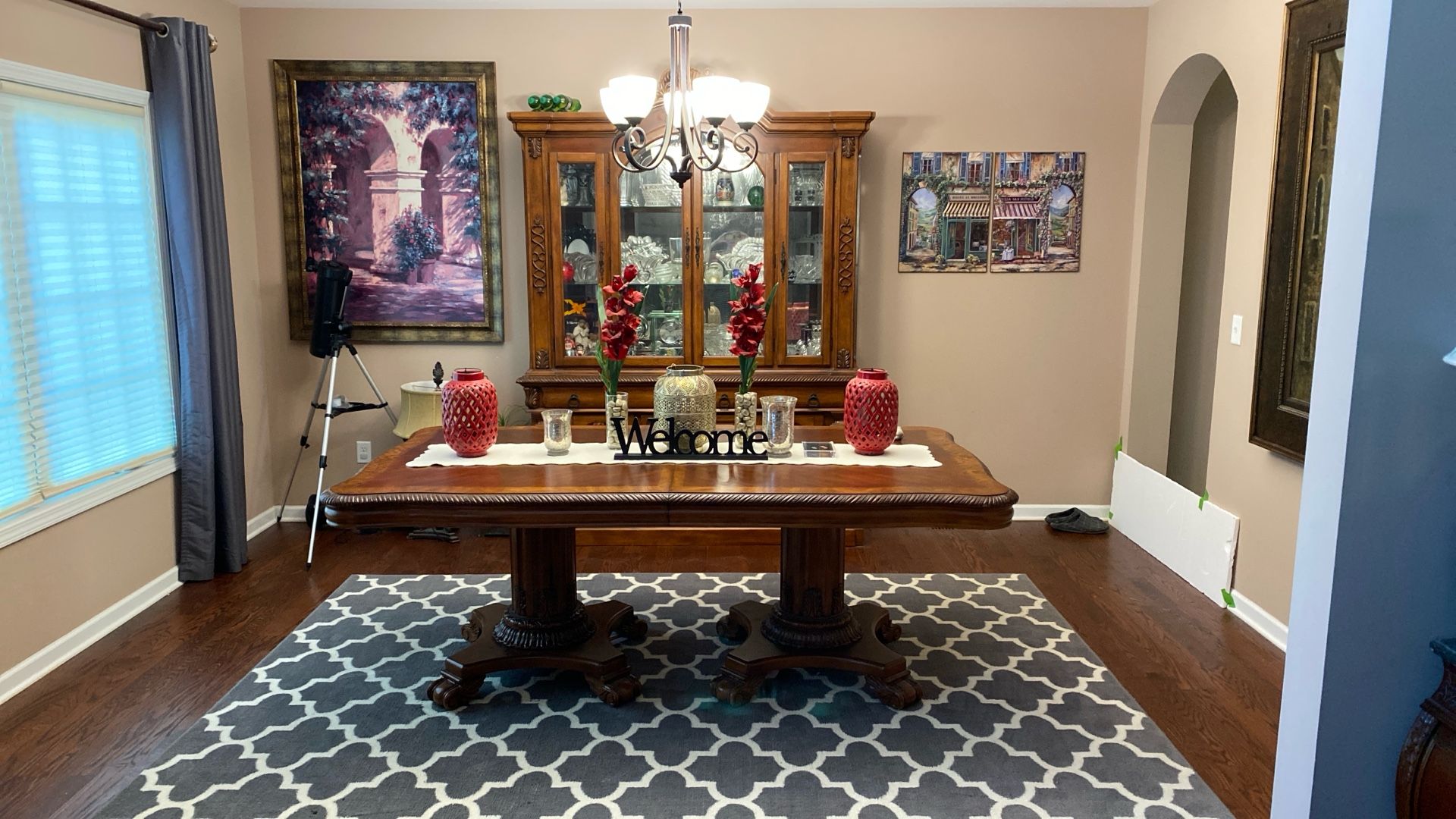 Beautiful, wood, dining table. Very heavy and sturdy. Can fit 6 chairs comfortably as is, approximately 8 chairs with the added leaf.