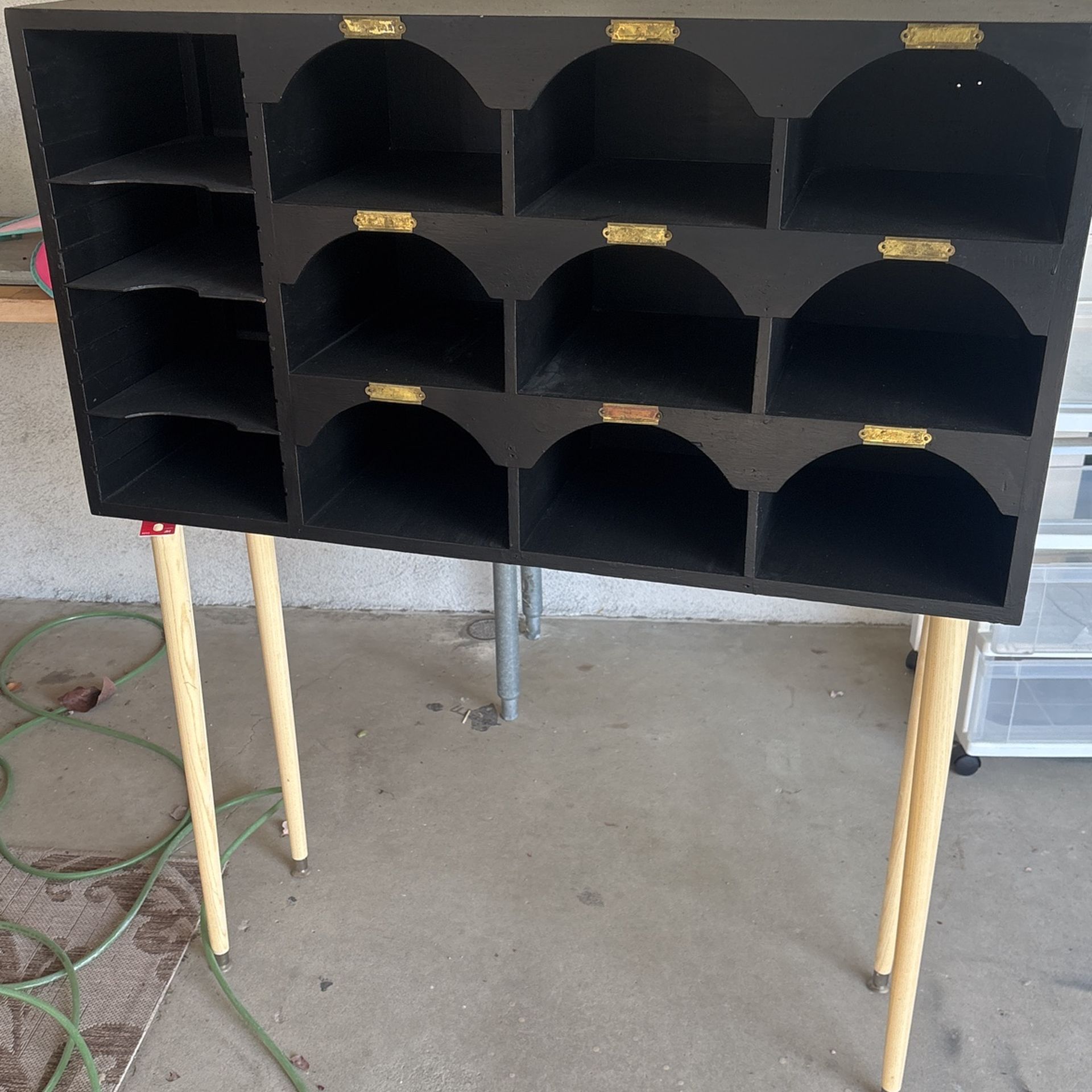One of a kind piece. My daughter used it as an entry way mail/message center. She organized mail, kept stationary/stamps, kept keys in a bowl, had a spot for her dog leashes. A basket underneath for shoes Lots of possibilities. I think it would be cute to get baskets to fit some of the cubbies and add labels. When she moved she gave it to me. I’ve used it for years in my craft room for paper supplies and more. I added the legs (they screw on). I meant to paint or stain them but never got to it. I love the piece but replaced it with a large cabinet to hold more craft supplies. See all pics for measurements.