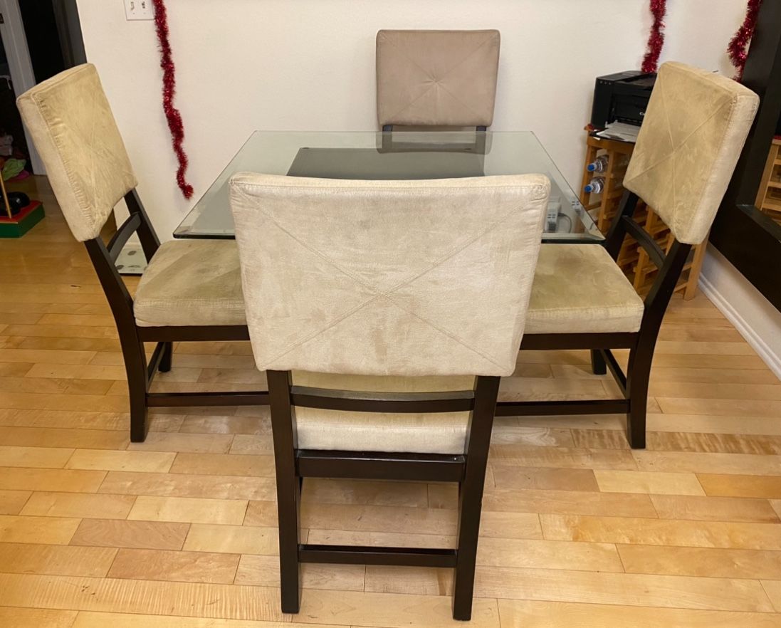 I have two glass tops: 36 x 36 in and 48 x 48 in. You can have either one or slightly more for both. In good condition. Chairs can be cleaned with steam cleaner.