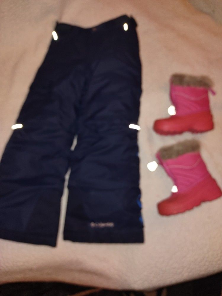 Snow pants Columbia size 8 small for KIDS and. Snow boots 9 used twice like new