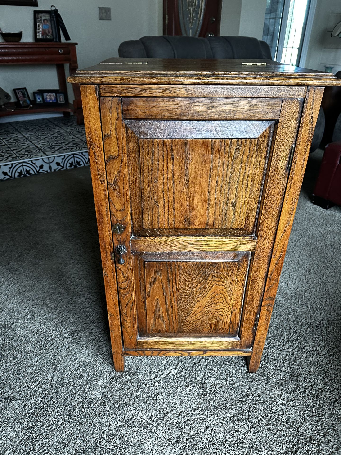 This item is an antique oak ice chest or box, a predecessor to the modern refrigerator used for keeping food cold. This one looks as though it was made into a record player box.