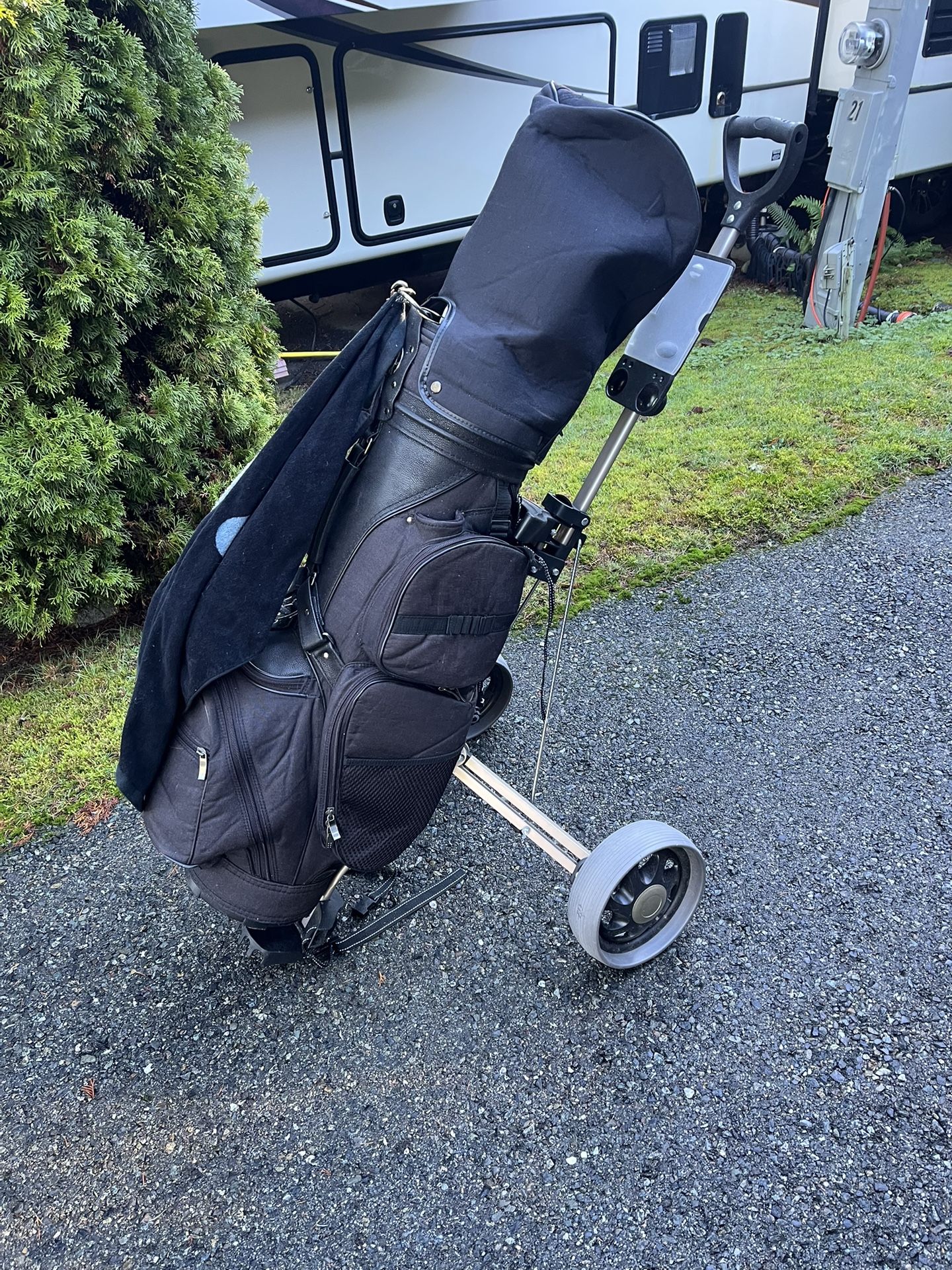 Full set of right hand golf clubs. Irons are graphite, has a very nice bag and pull cart.