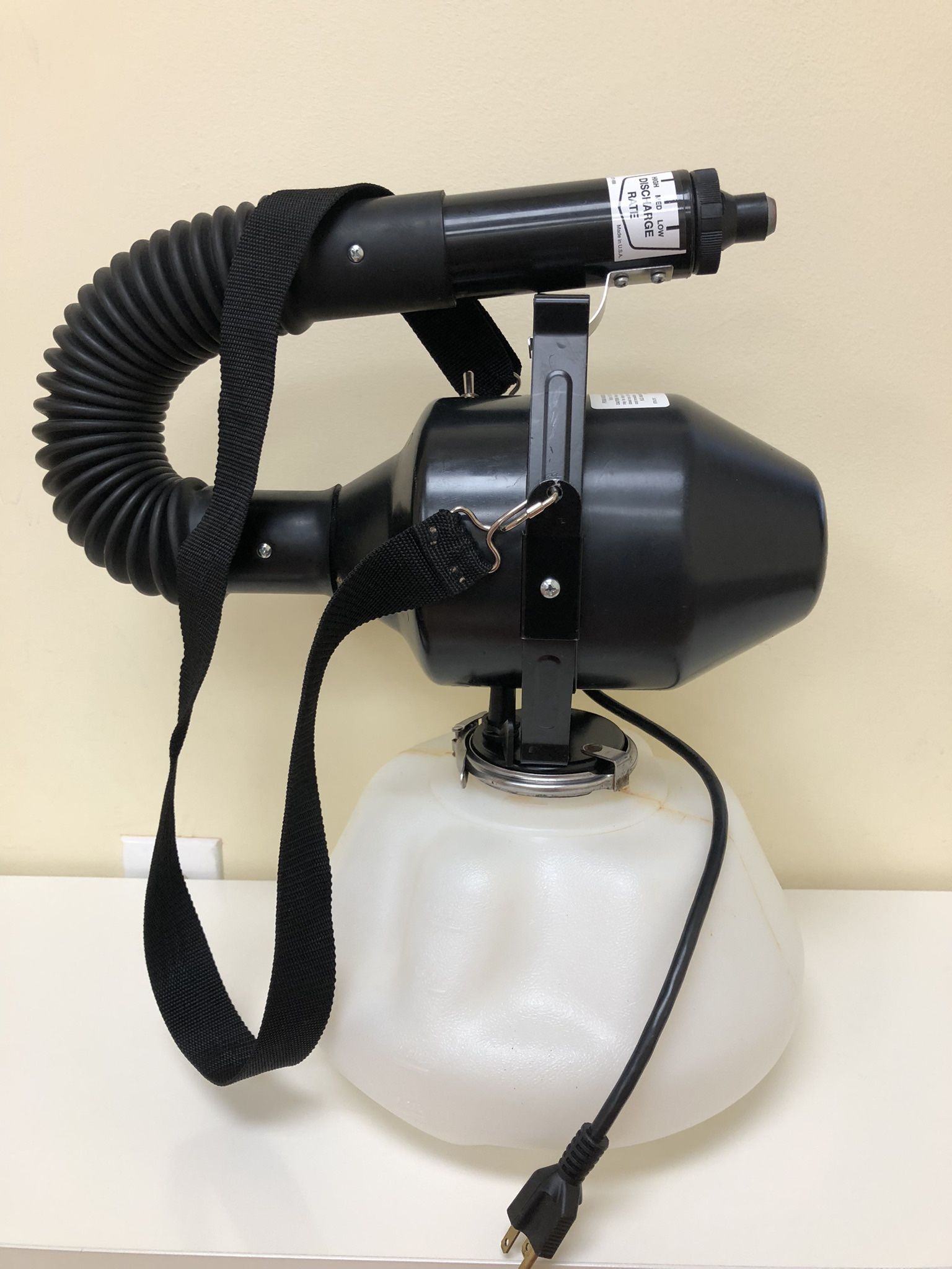 Was used only for indoor disinfectant Includes large commercial coiled hose for directing ULV chemical mist Lightweight poly tank – 2 gallon Carrying strap Operates on 110V AC power Shoots 13.5 feet For portable use