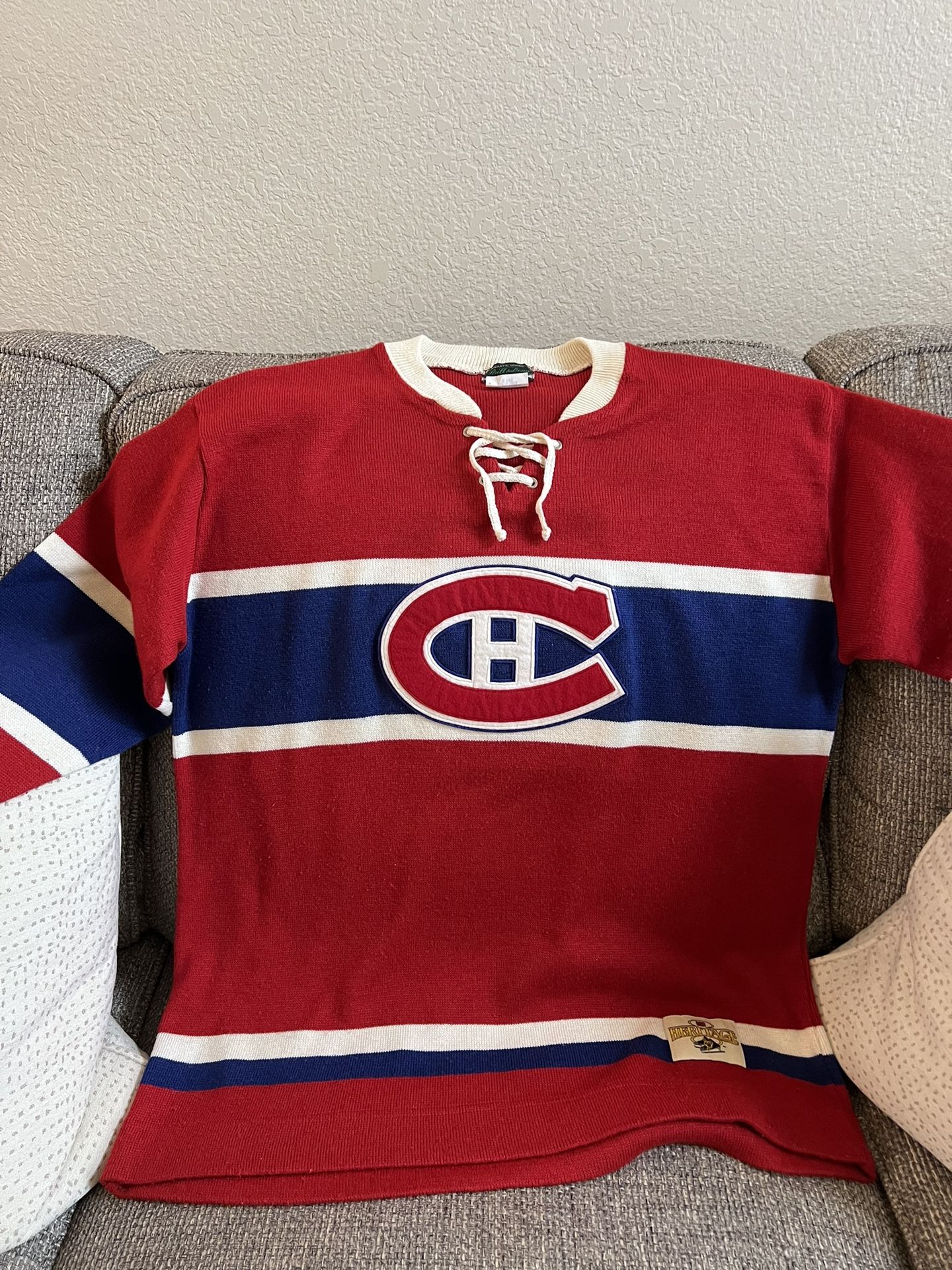 Perhaps a vintage hockey sweater. Beautiful bright colors with no fading. Size- XLarge Materials- 80% acrylic, 20% Laine/Wool in No holes and no patches Perfect condition. Negotiations are welcomed too stall & dean athletic goods montreal hockey