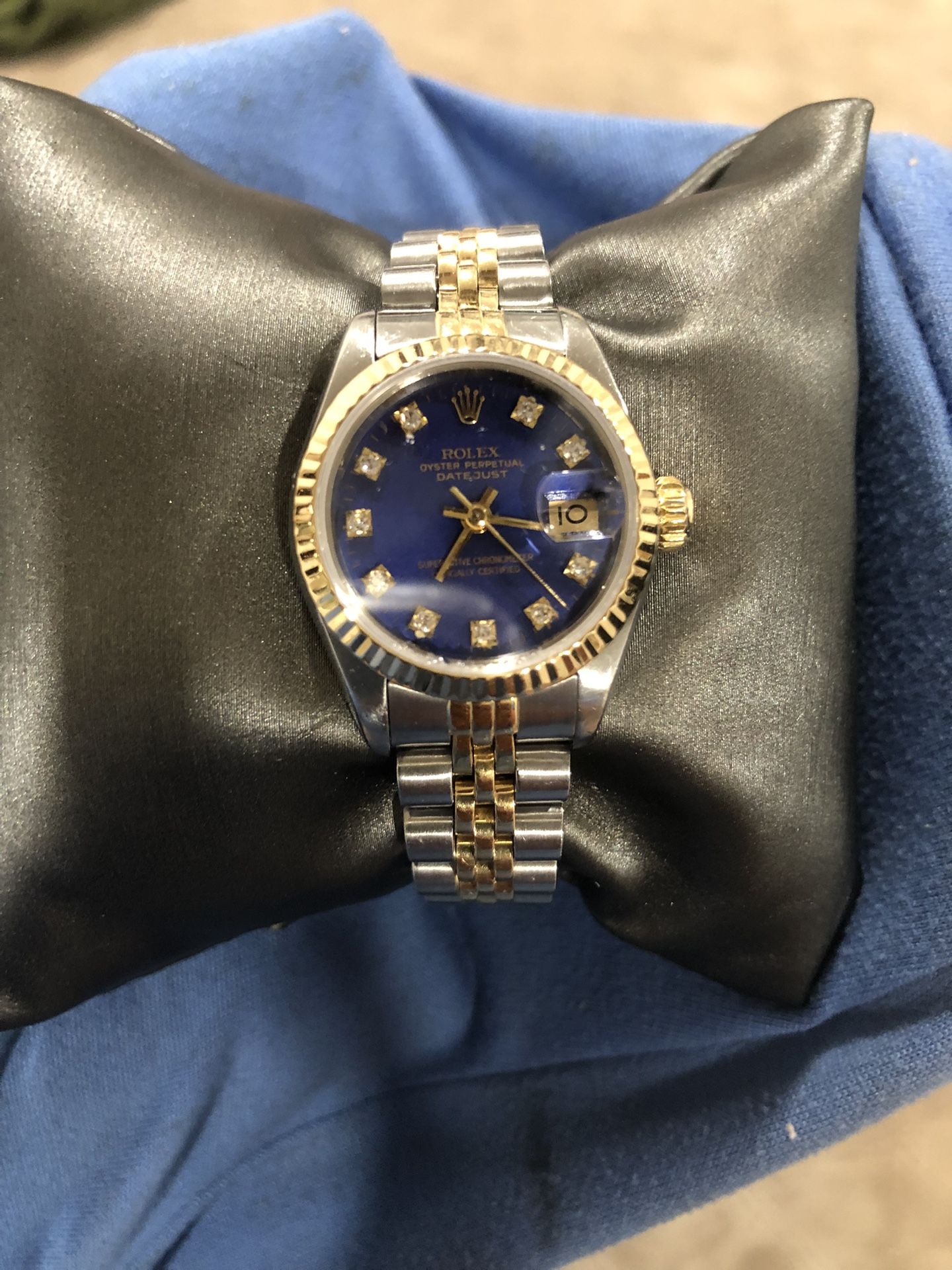 ROLEX Date just 26mm Blue dial Two tone Great watch comes with box Original watch No papers.. Great watch for Valentines gift. I bought it for $4,700 I will take $4000 cash only I bought it of vault jeweler’s 2 years ago hardly used Please only serious pleple…