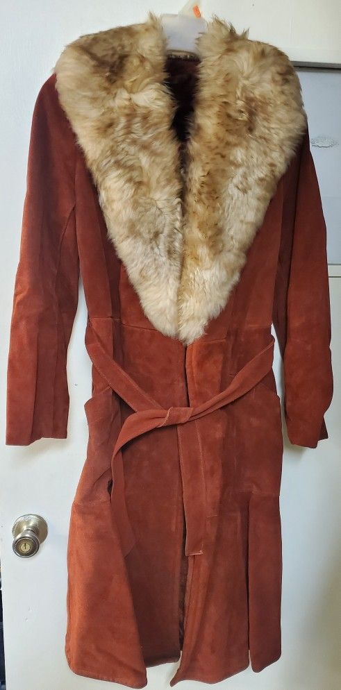 Amazing a LONG leather Suede fur lined coat with suede belt. Soft plush fur around the collar. Size small Pre-owned Looks New only wore a few times. No rips, tears or stains. BEAUTIFUL LEATHER COAT