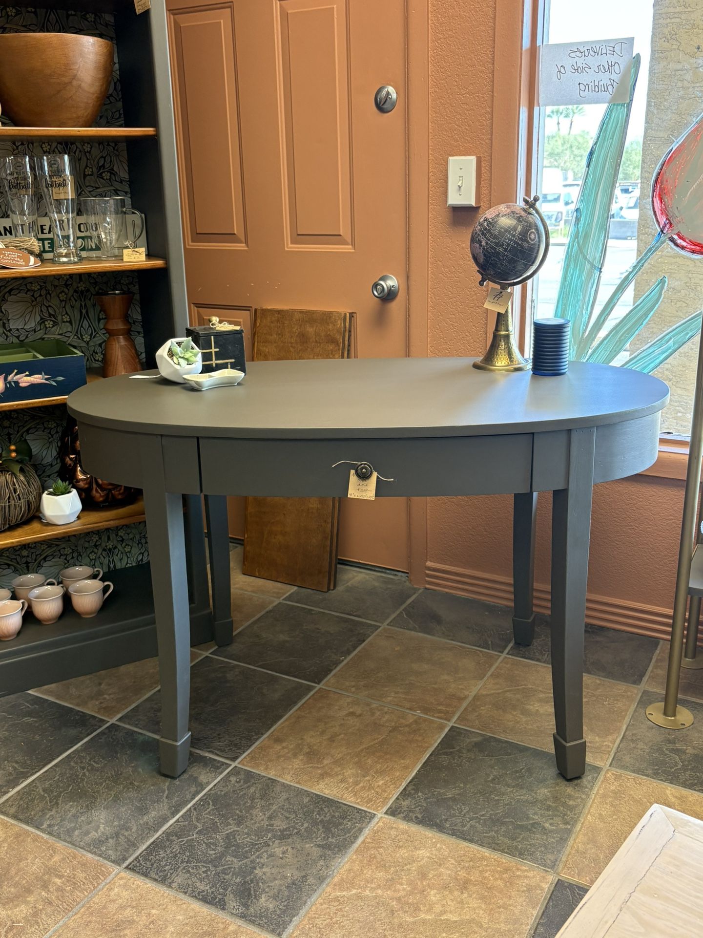 This oval desk has been painted in Oakham, a beautiful muddy grey tone from Fusion Mineral Paint. The drawer features a pretty liner. (Matching bookcase sold separately.) Dimensions: 48”W x 25.5”D x 29.5”H Must purchase and pick up at: 3 Vintage Chicks 13012 N Cave Creek Road Open 10-5 daily Local sales tax applies
