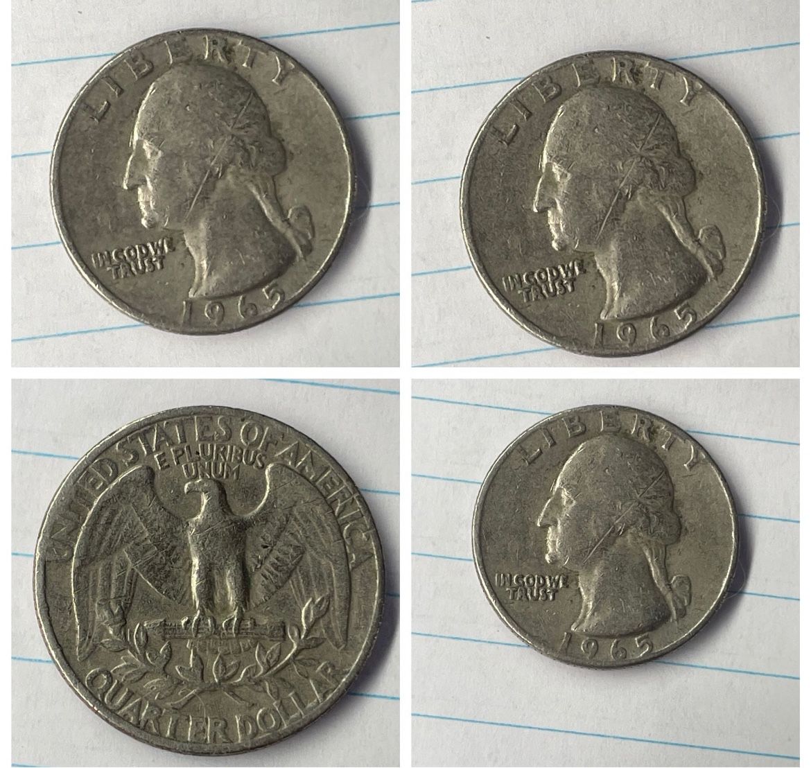 1965 no mint quarter with *filled A’s error, *a rim error and, *hub doubling I took as many detailed photos as possible you can clearly see the filled A’s and the double die is very noticeable in the “in god we trust” (the R especially) wile the rim error is most noticeable in the year, and the words “liberty,” and “united” *offers welcome*