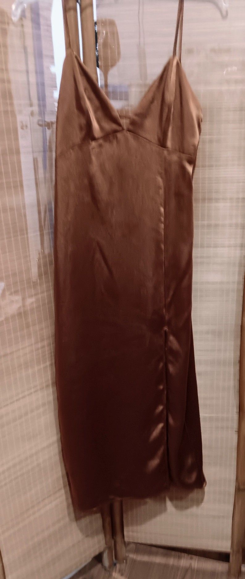 Slip dress shinny satin footwear bronze, adjustable straps, bra type top vneck, side zipper, slit, ties in back Size Medium 38" length from under bust, 15" pit to pit. NEVER WORN Please visit my page to view more items Thank you 4n2f/032726