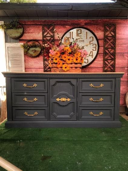 Vintage wood dresser, painted dark gray with gold handles, nine drawers,top is natural wood, sanded down, drawers work well, bring help with loading, delivery is available