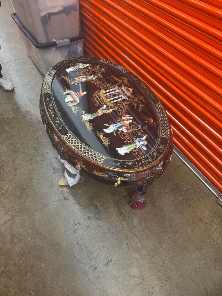 This is an oval Asian-style black lacquer coffee table, likely from the mid-20th century, featuring mother-of-pearl and hardstone inlay decorations.