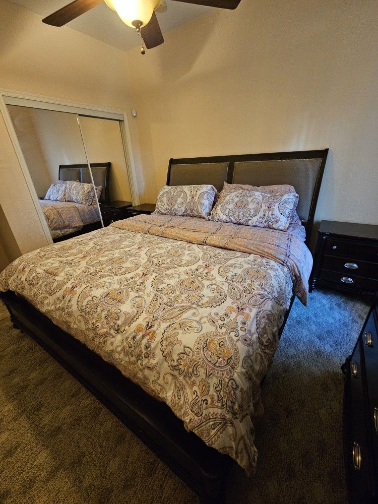 King Bedroom Set. With matching dresser and mirror. 2 matching night stands.