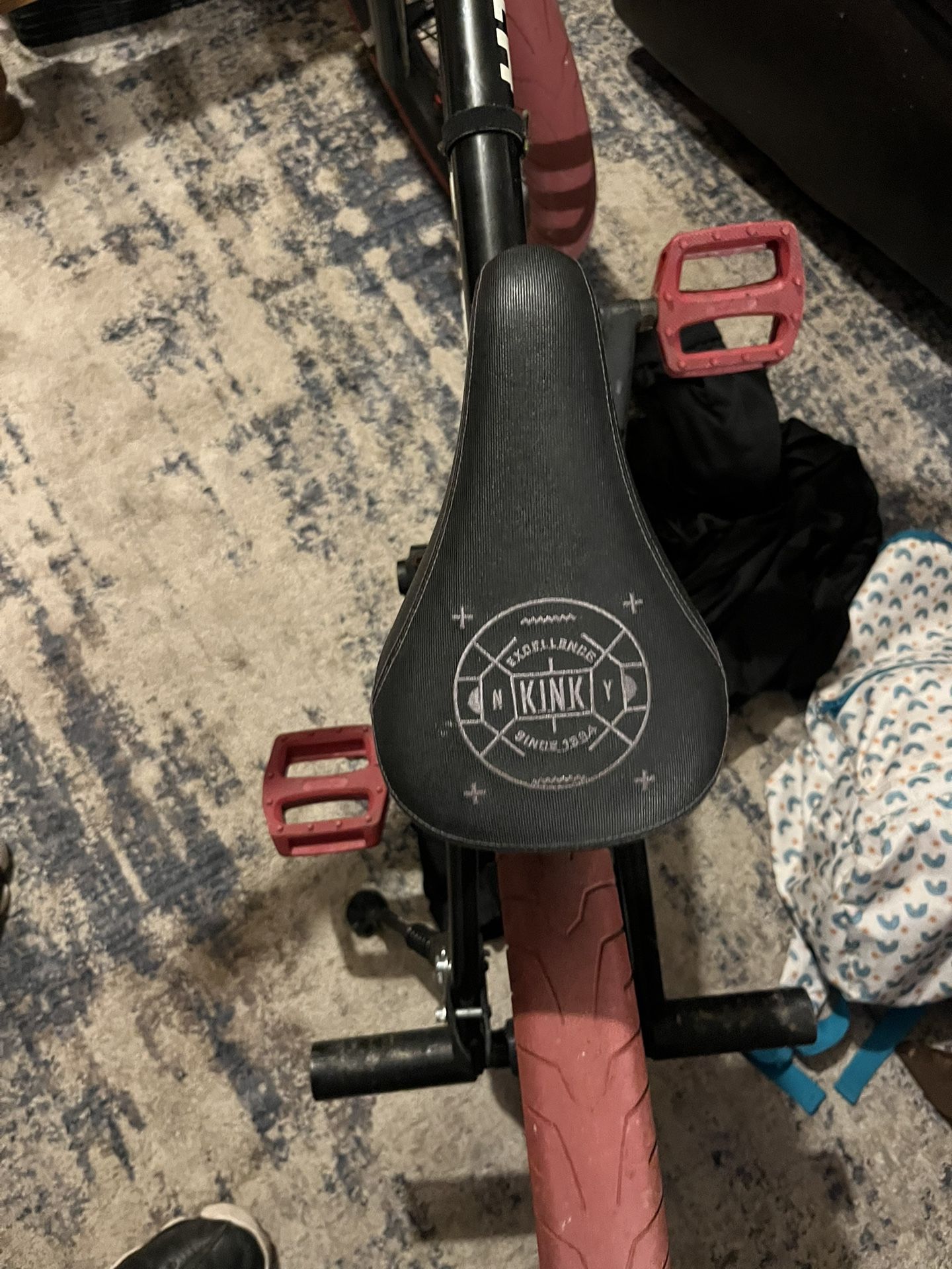Kink bmx bike 2020 20.5" TT KINK GAP FC MATTE GUINNESS BLACK>Frame Material: 100% 4130 Chromoly HT, TT and DT (TRI-MOLY+HITEN) Fork: Kink Stryker 4130 Chromoly Steerer Tapered HITEN Fork Legs Bars: Kink Grizzly CC 9” 100% 4130 Chromoly Grips: Kink Ace Flangeless | Barends: Kink Thrust Stem: Kink Bold HRD 50mm Headset: Mission Sealed Integrated (41.8 x 45) Brake Lever: Mission Token | Brake Cable: Mission L3 Linear Brakes: Mission Cease V2 Cranks: Kink Ridge 3pc Tubular Chromoly 170mm – 8 Spline Bottom Bracket: Sealed Mid 19mm Pedals: Kink Hemlock Chain: Mission 410 Sprocket: Mission Rank 25T Front Hub: Mission Covert Unsealed 3/8″ Axle Rear Hub: Mission Deploy Sealed Freecoaster 14mm | Driver: Sealed 9T Rims: Mission X7 Seat: Kink Marion Stealth Post: Mission Stealth | Clamp: Mission Slim Tires: Kink Sever 2.4″ - RED Gyro Tabs: Drilled & Tapped for Tabs Weight: 27lb 2oz Will trade