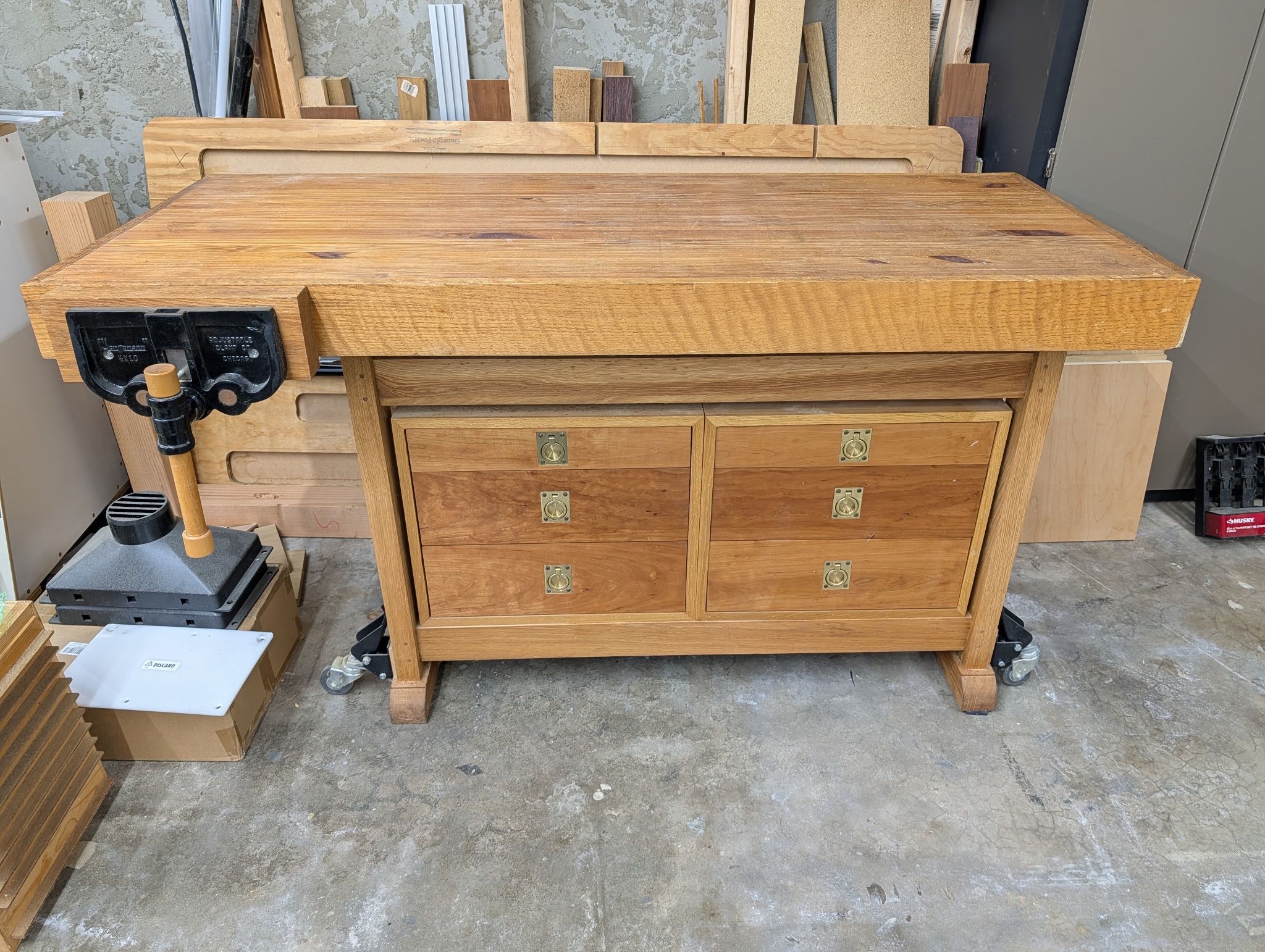 Workbench, Jorgensen vise and casters with drawers Workbench Width = 61 1/4", Depth = 25 1/4", Height = 33 3/4"