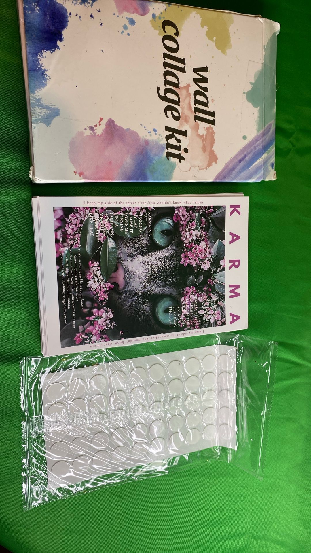 Wall collage kit with sticky gel things to safely stick them to your wall without making holes. Amazing pictures, and quotes on every single miniature poster. Had ordered post cards but these came by mistake so definitely have no need for this. Kit contains 50 miniature posters with 50 of the sticky gel stuff.