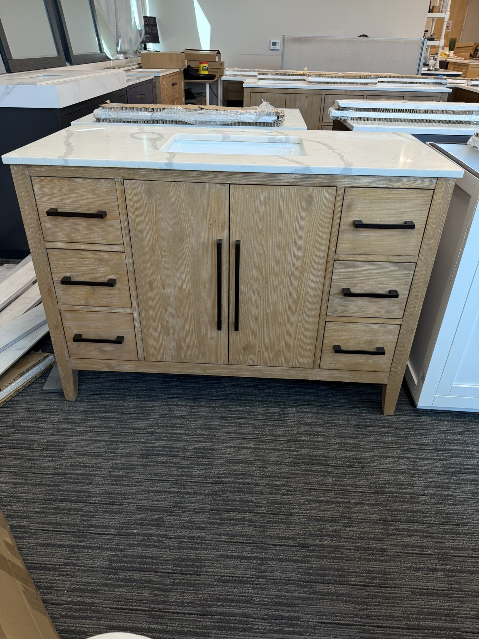 48” wBathroom Vanity in wood color ,with quartz countertop ,with solid wood frame ,with soft closing doors and soft closing drawers