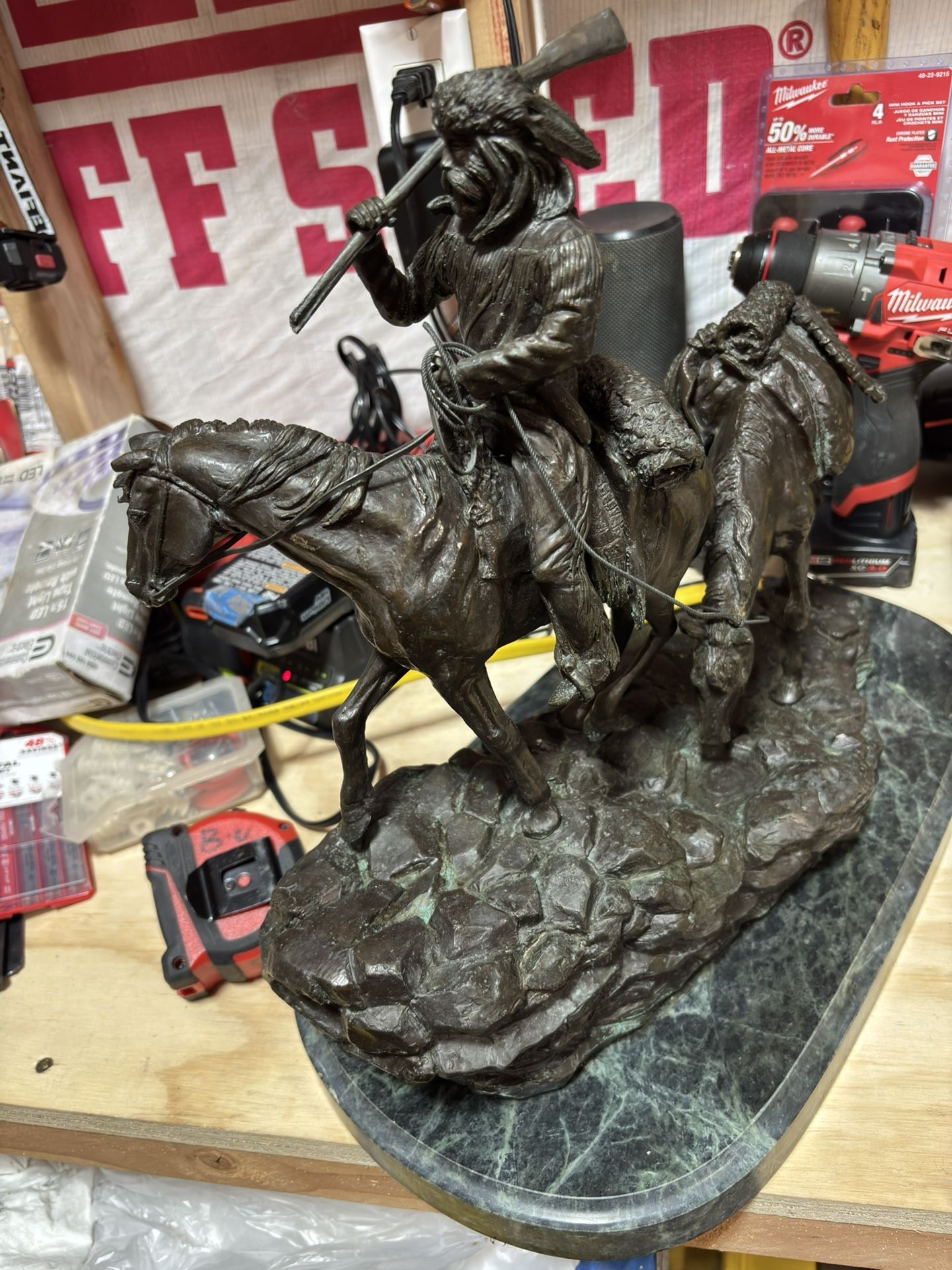 "A White Trapper" Solid Bronze Collectible Sculpture Statue Inspired by Frederic Remington.Approx. 17" across by 15" tall. Weighs 39 pounds 10 ounces.Pre-owned in great condition with no issues. Mounted on a fine marble base, This American Bronze edition has outstanding detail is worthy of inclusion in any Remington collection.