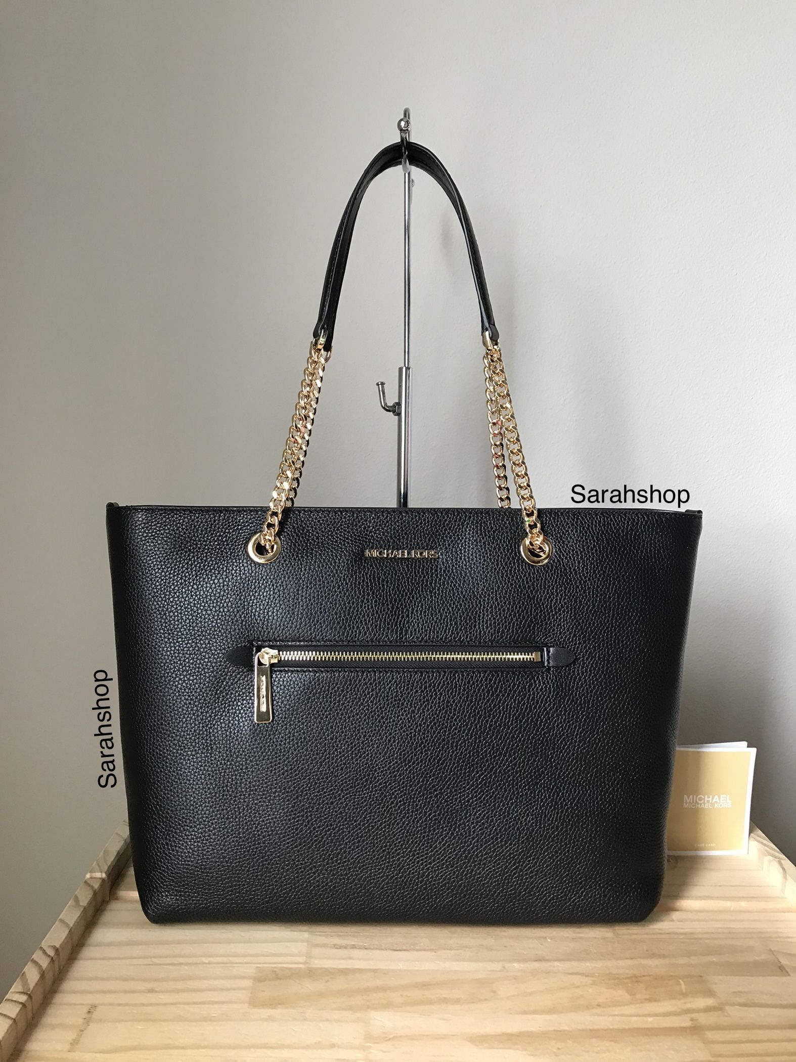 100% Authentic MK Jet set item LG front zip chain tote Leather Black and gold hardware **Brand new with tags** Approximate Measurements: 13”bottom"L, 17”L top x 10.5"H x 5” D Chain handles with 11" drop
