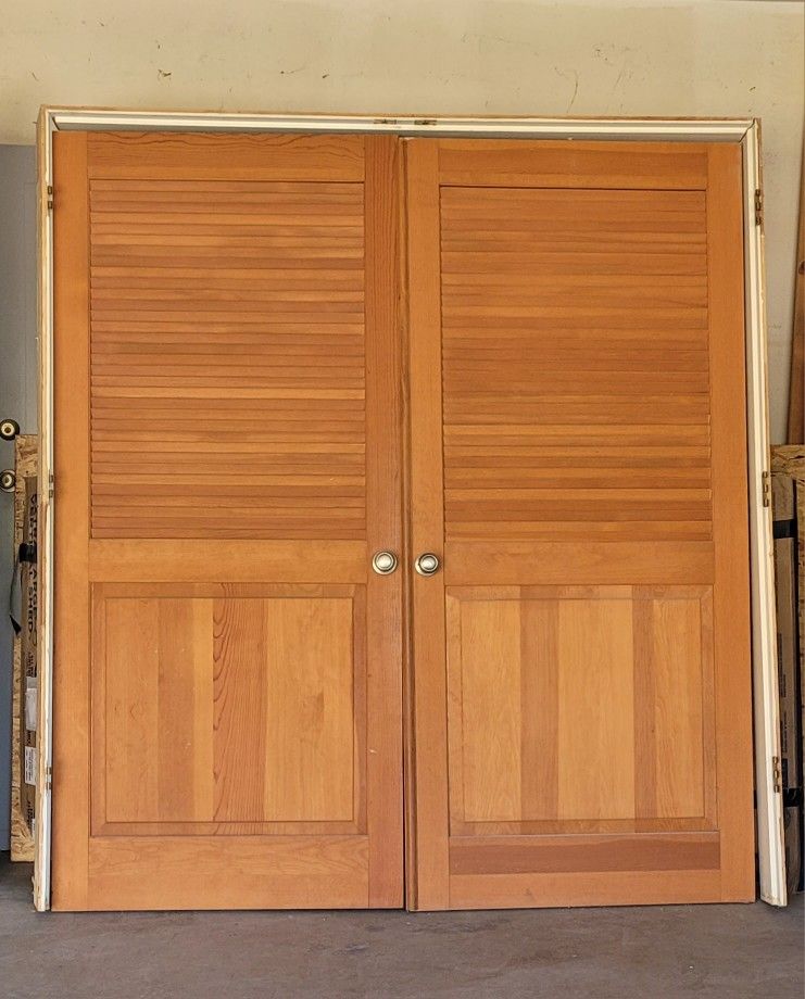 72x80 Douglas Fir Raised Panel Louvered Doors with Frame. $50 obo
