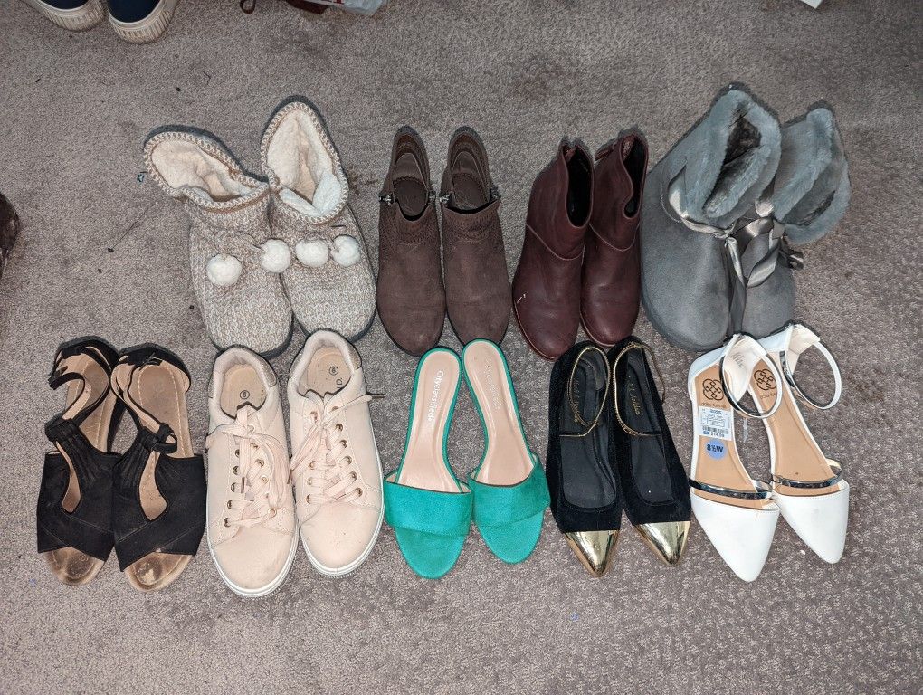 9 shoe pairs of ankle boot bys, flats, and slippers varying in size for $40. For more information send a message