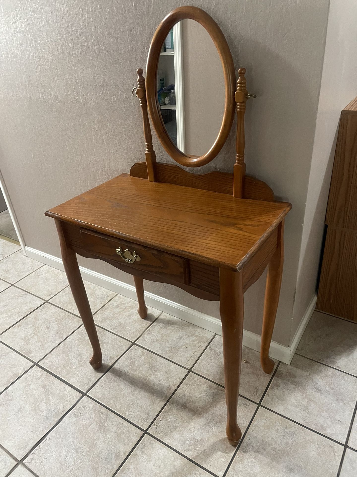 Made of solid hardwood. A timely piece with mirror and drawer. No stool.