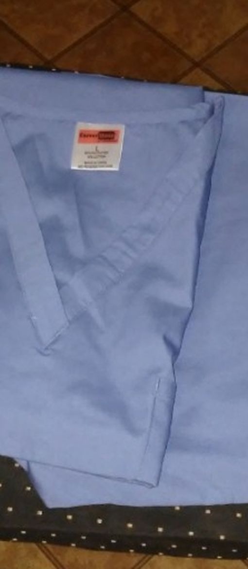 BRAND NEW 2 PC SCRUB SET. TOP V NECK. PANTS REVERSIBLE, DRAW STRING, BACK POCKET. COLOR, BLUE, SIZE LG. Cash Only.