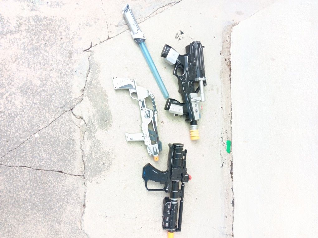 Used silver one has batteries and works. The other 2 don't have batteries. Don't know if they work should work if you put batteries in them but I haven't. One of the guns is missing something on the top don't know if it fell or something's broken or missing.These are from childhood thanks send me an offer thanks