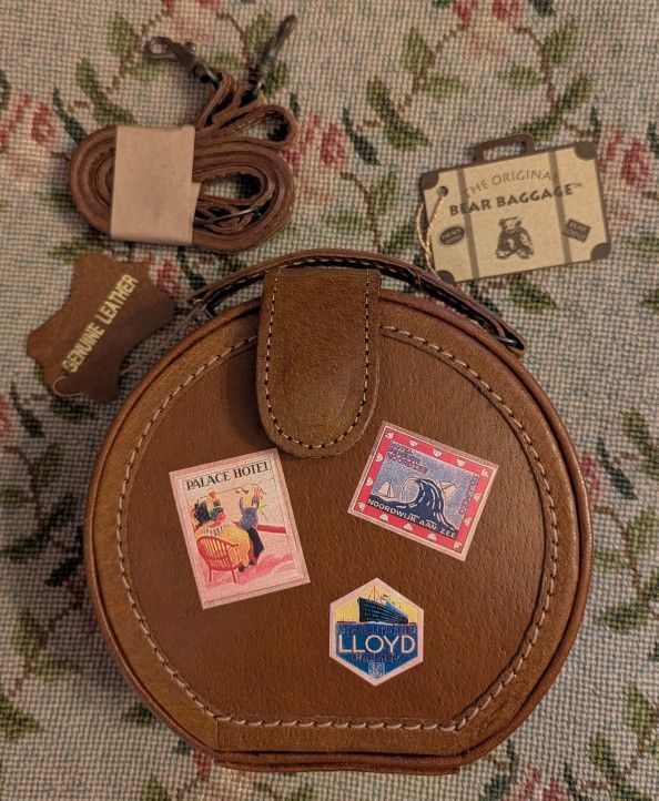 Small toy luggage Original Bear Baggage hat Box or suitcase Genuine Leather 5.5" round 3" deep Comes with unused strap