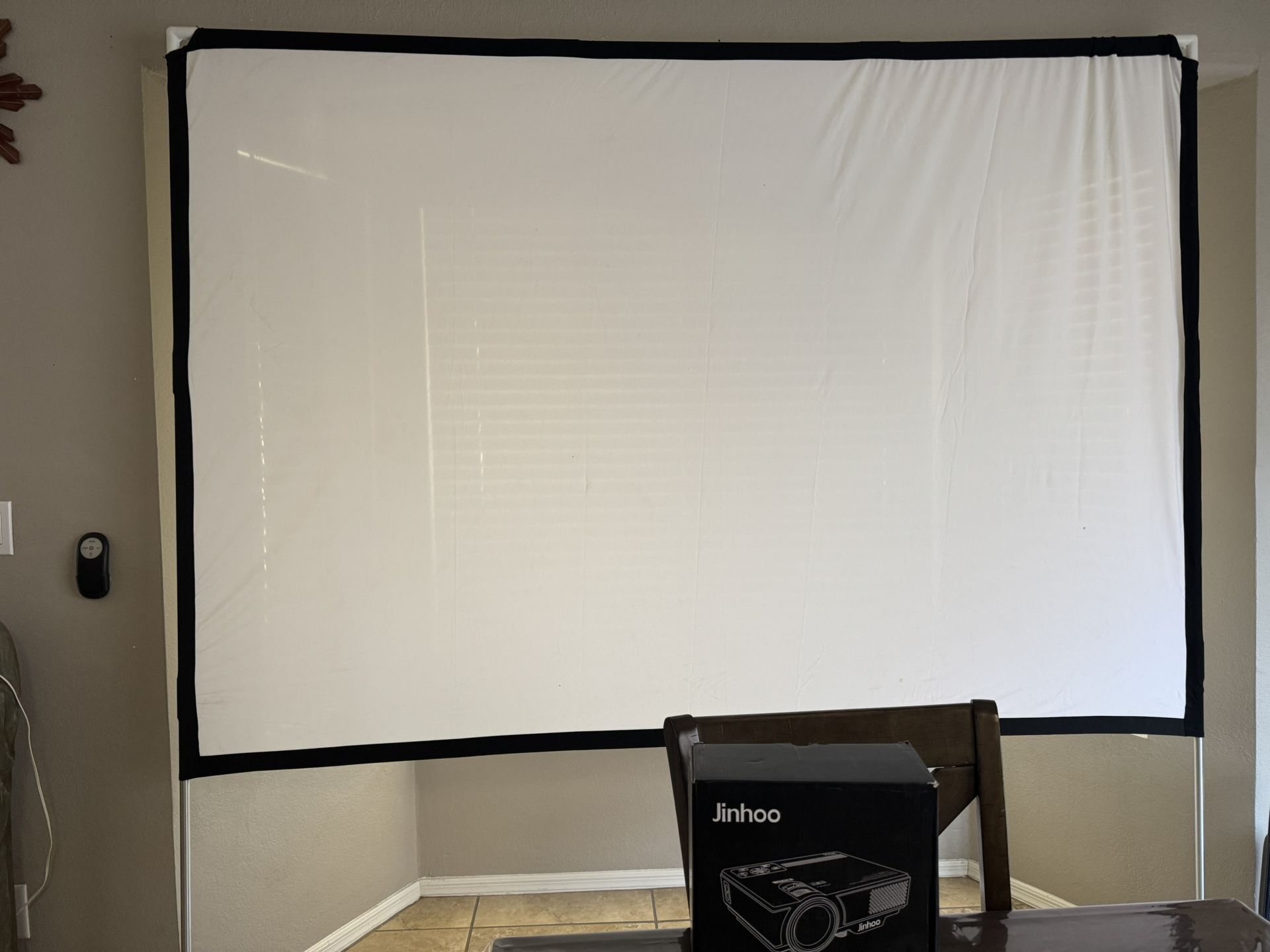 Mini video projector 1080P with projector screen with stand.Its available as long as you see this post. Check photos for more details. The screen measurements are 60”x86” New The price for all