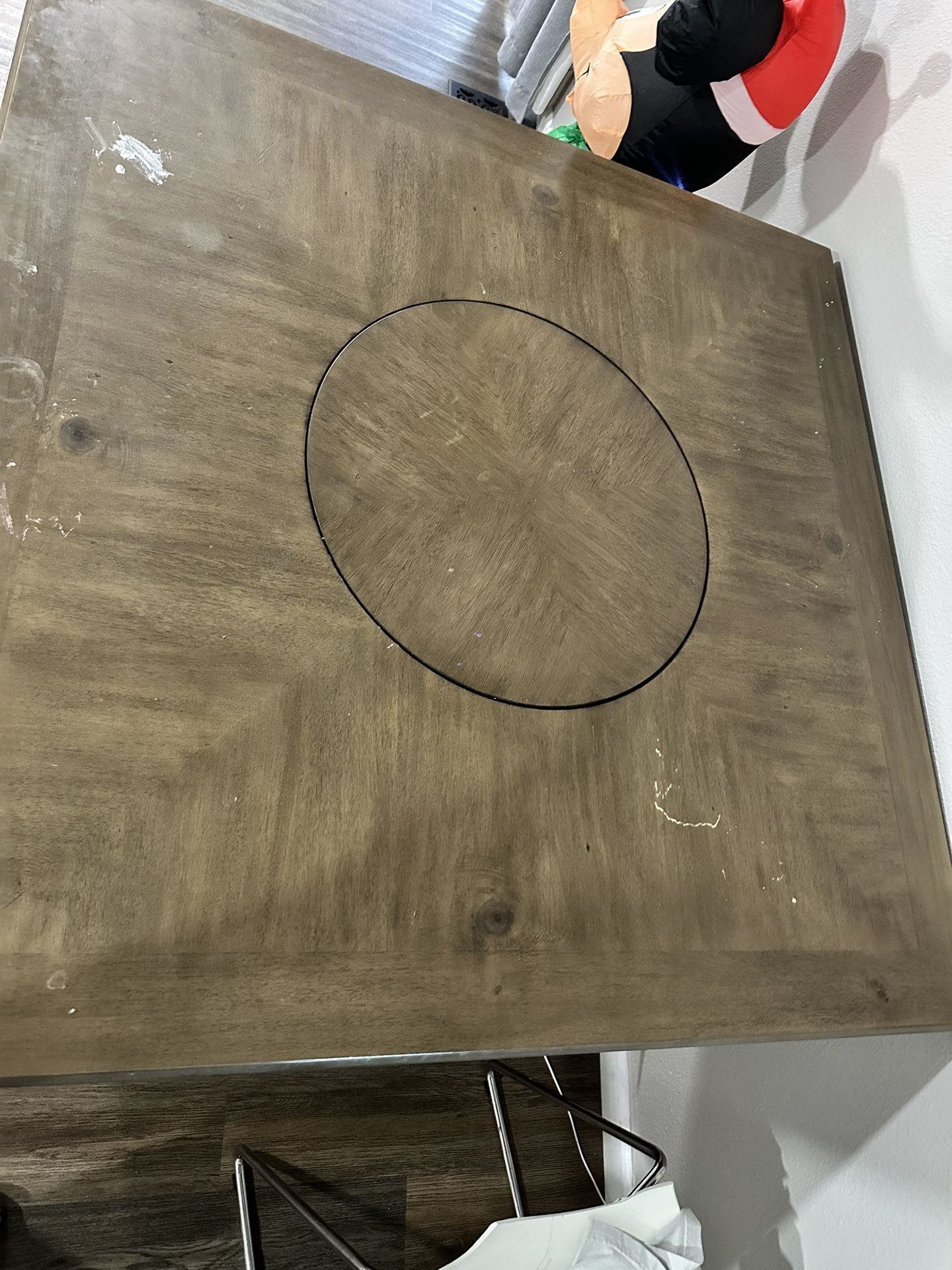 4ft x 4ft, has a small circle in the middle that rotates, good for charcuterie boards or snacks