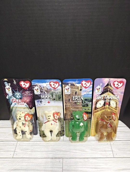 Ty Beanie Babies Britannia Glory Erin Maple The Bear McDonalds Set 1999 Unopened. Packaging has some wear and damage from age and storage. See pictures. Sold as is.