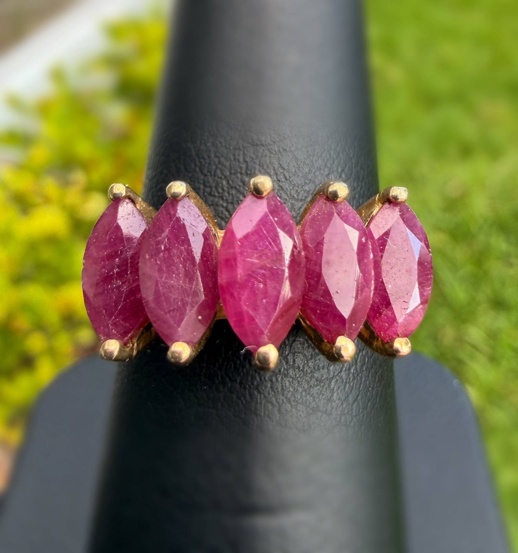 This gorgeous red dyed ruby stones ring is made of solid 10k yellow gold with spike marquis cut. Total weight of the ruby stones is approximately 1.50 carats. Ring size: 7.00 Total weight: 3.80 grams. Very beautiful and elegant. Comes with nice jewellery box. With this ring she will definitely say yes! The best choice for you! Perfect gift! β€οΈππ We buy Rolex and Audemars, patek . Do layaway in VIP PAWN Coral Springs π₯ππΈ