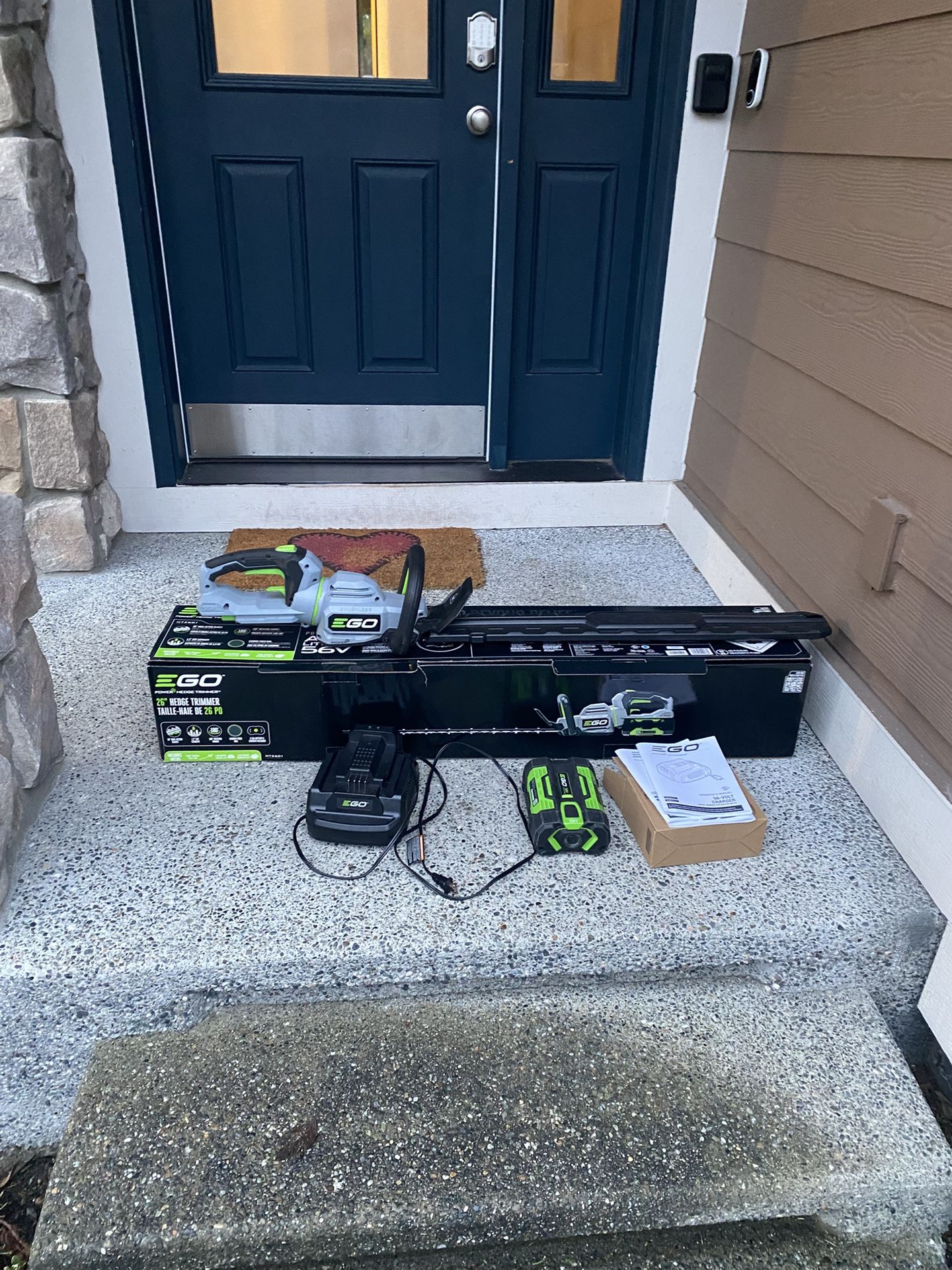 EGO power HT -2601 26 inch hedge trimmer with battery and charger. 1.2 – inch cut . Five position 180° rotating handle . Up to 60 minutes run time . Carbon fiber rail . High efficiency, brushless motor. Excellent like new condition I bought this hedge trimmer last summer brand new and used it for 4 to 5 times. Works really great! Very smooth with one battery charge . I’m only selling it because I just moved to a house that I am renting with very small yard and no need for hedge trimmer.