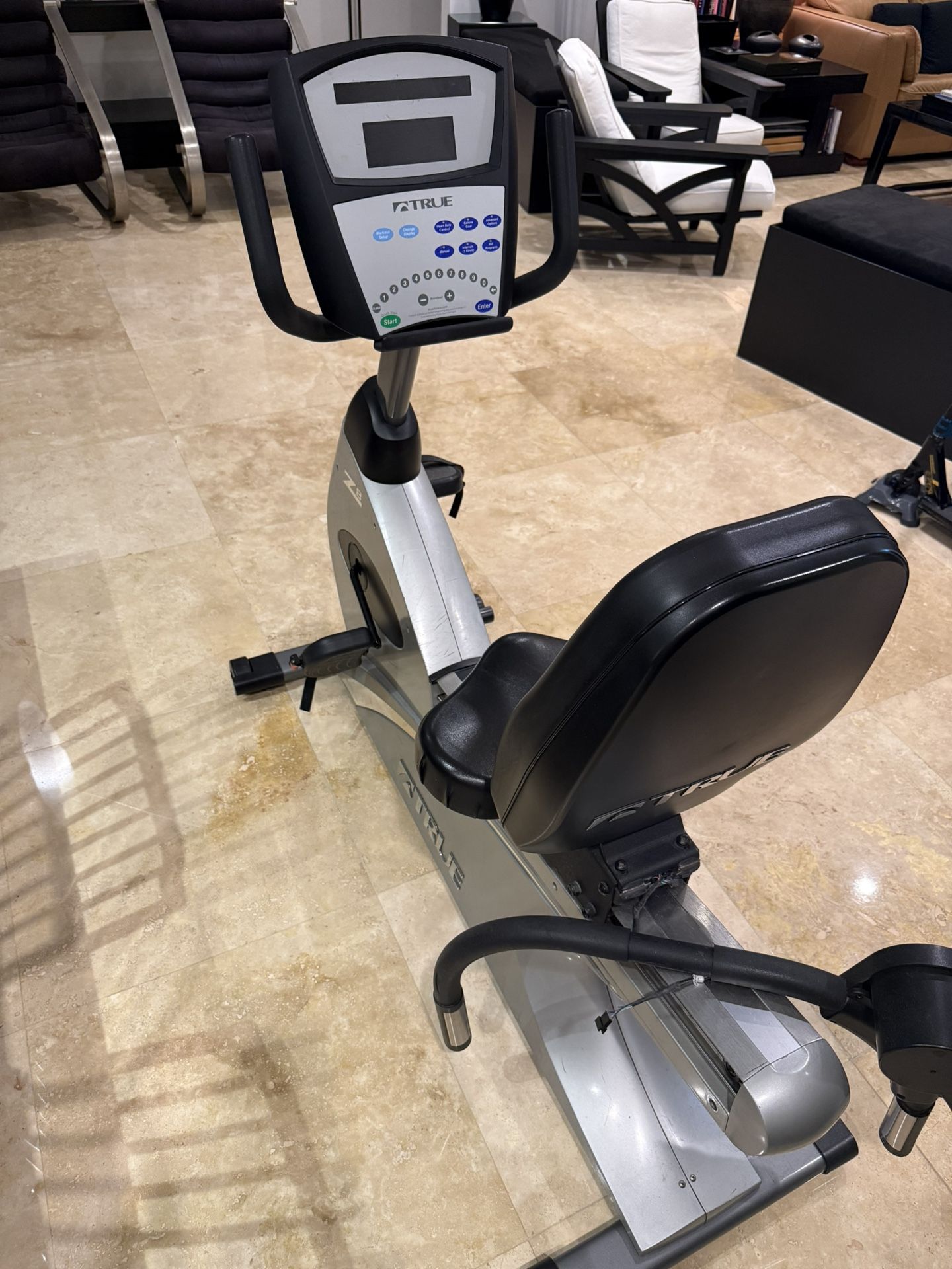 Used TRUE Fitness recumbent exercise bike, commercial-grade and very sturdy. Smooth, quiet ride with adjustable resistance and workout programs. Comfortable padded seat with back support, ideal for low-impact cardio or rehab. Hand heart rate sensors are not working, but the bike functions normally otherwise. Pickup only. Cash only.