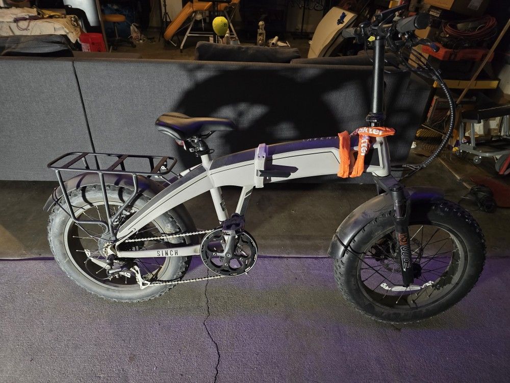 Excellent condition Aventon Sinch. This is the ultimate "go-anywhere" folding bike. It fits easily in a trunk or RV but rides like a full-size mountain bike thanks to the massive 4-inch fat tires. Performance: Motor: 500W (Sustained) / 750W (Peak) Brushless Rear Hub Motor Top Speed: 20 MPH (Class 2) via Pedal Assist or Throttle Battery: 48V / 14Ah (672Wh) Lithium-ion with LG cells (Removable & Lockable) Range: ~40 miles average depending on terrain and assist level Charger: 48V 3 Amp Fast Charger (4-5 hour charge time)