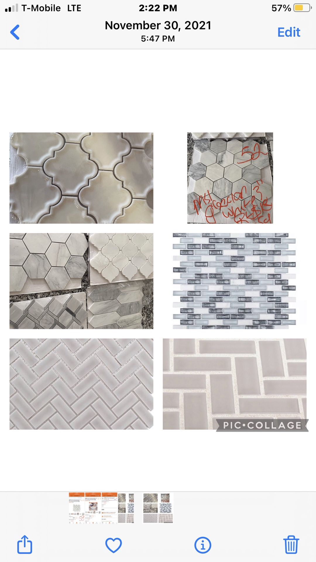Overstock tile for sale, all individually inspected for flaws. These are all 100% showroom condition. Will Update when sold Herringbone Grey 3” marble hex