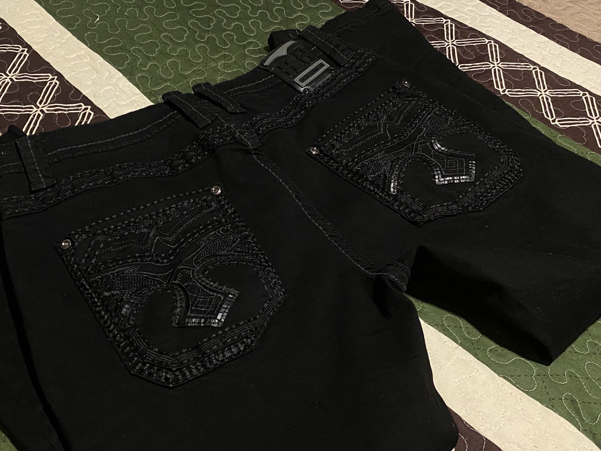 38x30 black rock revolution jeans. I love the pants but they don’t fit me, they’re more of a tight fit on the legs but other than that these are the best jeans I’ve owned. Never really used them, but they’re great quality and condition.