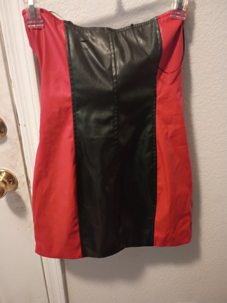 Strapless faux leather mini dress by Windsor. Black center with contrasting red panels. Front exposed zipper detail. Sleek, fitted silhouette. **never worn**