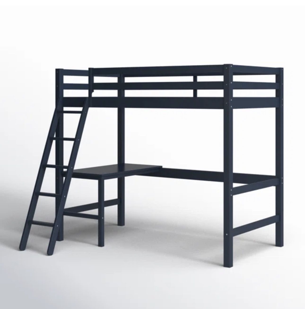 Twin Loft Bed w/ Built-In Desk – $320 • Navy wood frame • Integrated workspace • Space-saving design