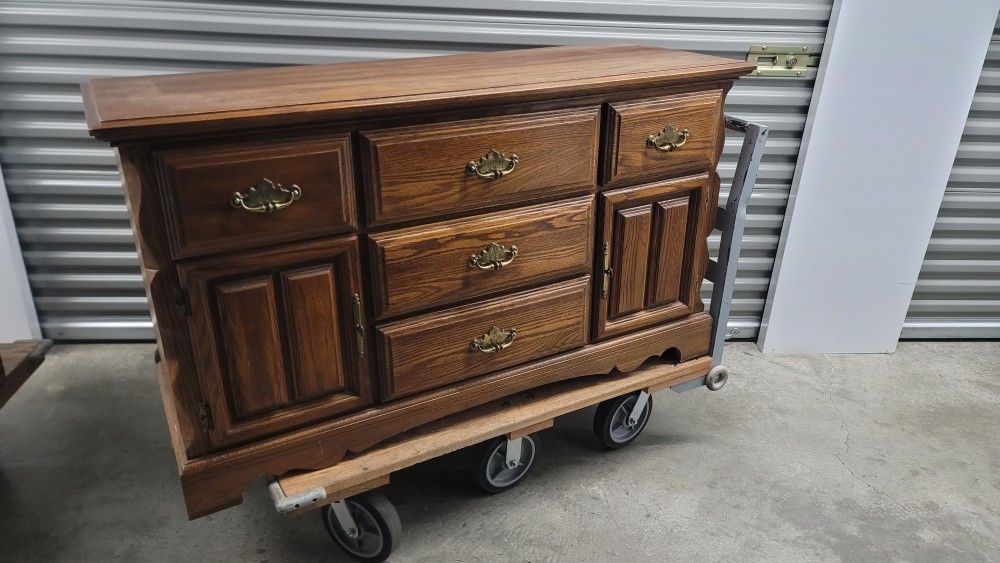 Condition: Pre-owned vintage condition. Both pieces are structurally sound and pair perfectly together. The glass doors are fully intact with no cracks or chips. Drawers and cabinet doors operate smoothly. There is minor surface wear on the lower buffet top where the hutch rests, consistent with normal age and use, but overall the set is in excellent, display-ready shape. Description: Manufacturer: Crafted in the USA by Cochrane Furniture Co., Inc. (Lincolnton, N.C.), renowned for high-quality, solid wood manufacturing. Material: Heavy, solid oak wood construction featuring a rich, traditional wood grain finish. 2-Piece Design: The bottom credenza features five spacious center drawers and two side cabinets with raised panel doors. The top hutch features three elegant glass-paneled display doors with classic scalloped wood trim. Hardware: Accented with vintage brass-style pull handles and exterior hinges. Lighting: The top hutch includes internal wiring for display lighting to showcase fine china or collectibles. Why spend thousands on modern, mass-produced particleboard furniture at a big box store when you can invest in genuine, American-made solid oak? This 2-piece heirloom quality cabinet is built to last generations and is ready to add instant farmhouse charm to your home today. It also makes an incredible, high-end canvas for a custom painted upcycle project.
